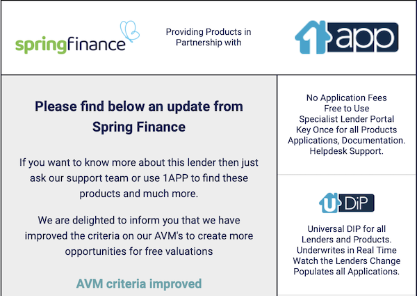 Please find below an update from Spring Finance If you want to know more about this lender then just ask our support team or use 1APP to find these products and much more. We are delighted to inform you that we have improved the criteria on our AVM’s to create more opportunities for free valuations […]